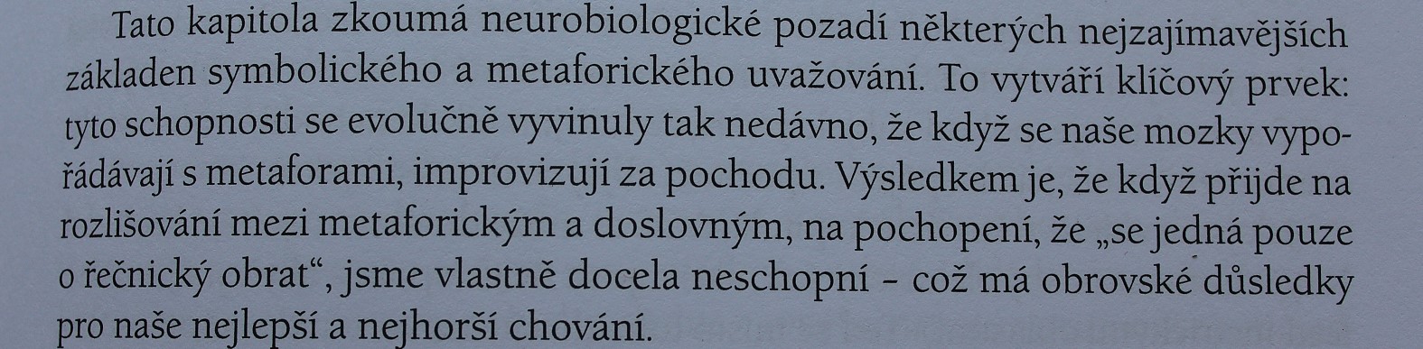 My lidi, přesněji asi – náš mozek, nedokáže spolehlivě odlišit metaforu od skutečnosti! To znamená, že přirovnání je pro naše myšlení stejně skutečné jako vlastní palec, o který zakopneme. Kdybych vám vyprávěl o vších či mravencích na intimních místech budete se drbat, i když mravenci u vás žádní nejsou!