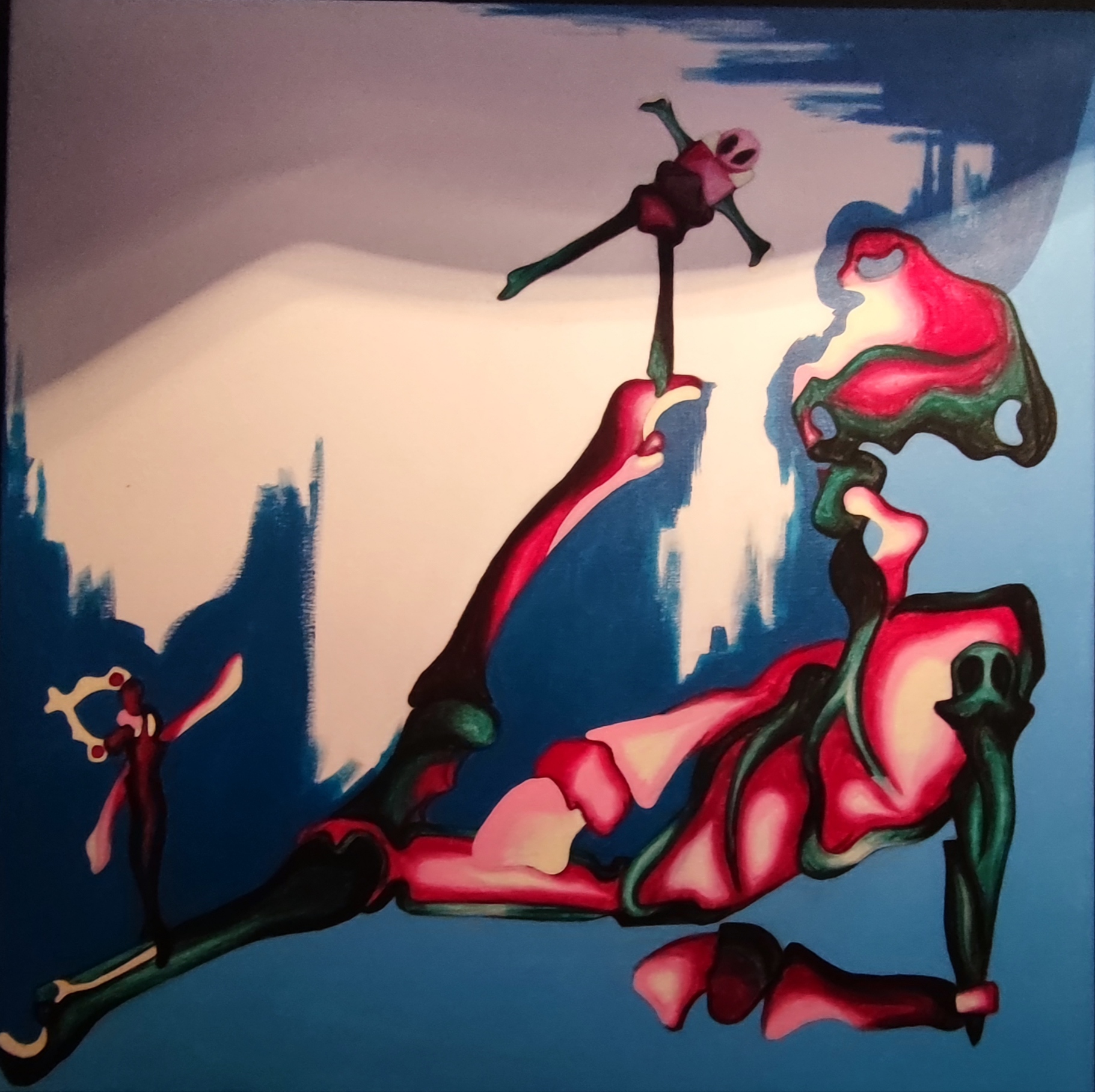 Osobně jsem nejvíce času strávil nad obrazy, které byly vytvořeny v časech pandemie, protože to byla a je doba, která Dominiku Vyskočilovou silně inspiruje a umělecky žene do další tvorby. Musím se přiznat, že některé z těchto „pandemických“ obrazů mi naháněly obavy, ať už se jednalo o celkovou kompozici obrazů, nebo výběr mnohdy sytých barev, celkové nasvícení obrazů a podobně.