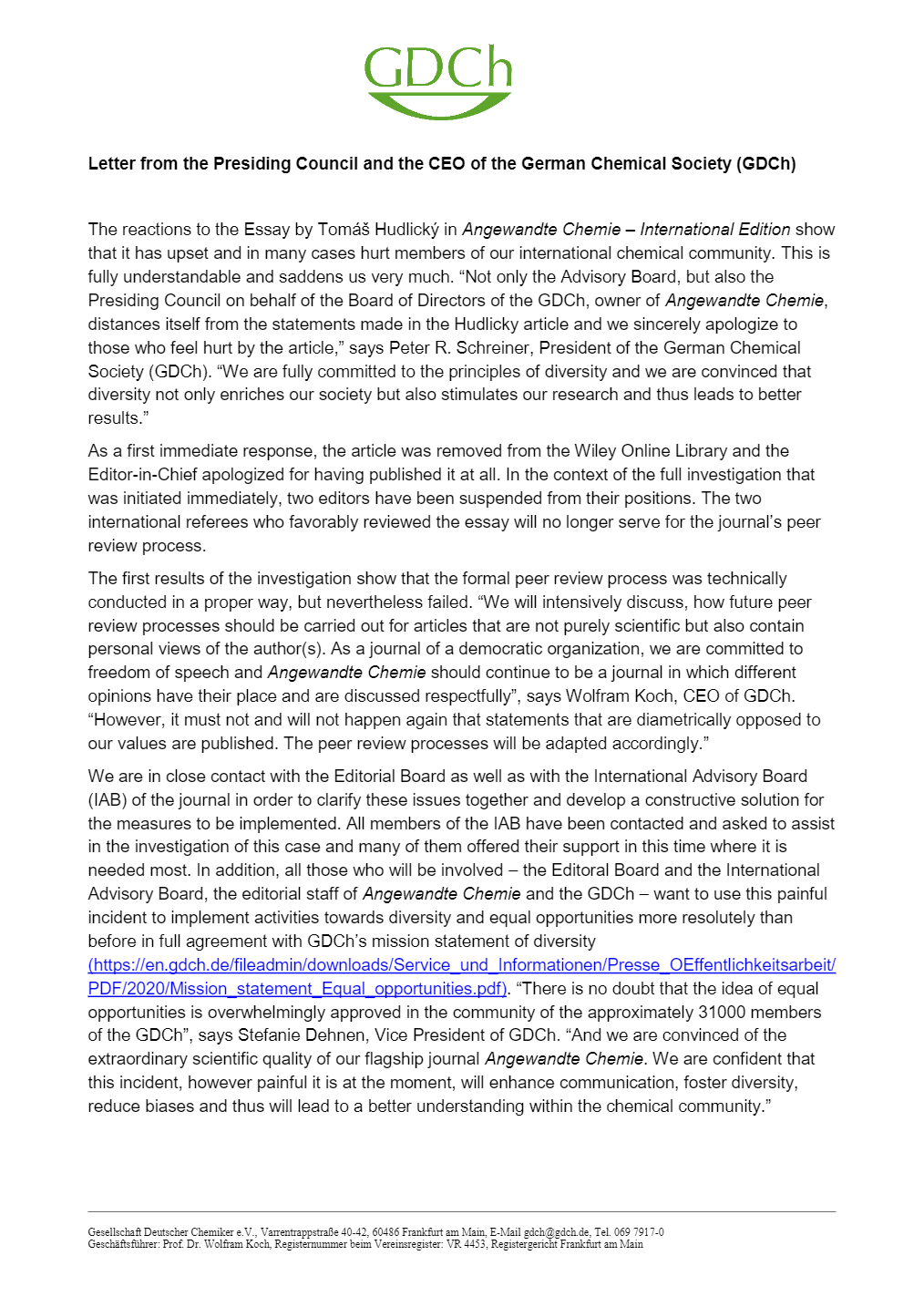 V případě Angewandte Chemie to pousmání nebylo. Redakce po krátkém, leč nepochybně intenzivním vyšetřování stáhla Hudlického článek, rozvázala spolupráci s oběma lidmi, kteří jej revidovali a schválili, a potrestala dva editory. Inu, chcete-li důkladný Ordnung, u Němců se nezklamete. (Pokud nejde o Stuttgart v noci nebo Kolín nad Rýnem v jiné noci, nebo, nebo…)