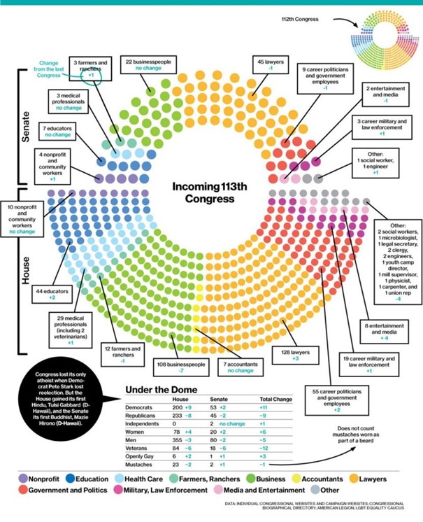 Samozřejmě existuje nějaká přirozená afinita mezi lidmi, kteří studovali práva, a zákonodárným sborem. Dá se čekat, že v parlamentu bude právníků více než v běžné populaci. Ale zároveň tím vzniká otázka, zda ti poslanci-právníci a senátoři-právníci náhodou nevyrábějí právní normy, které jiným právníkům – nebo dokonce jim samotným poté, co z Kongresu odejdou – zajistí dostatečné množství dobře honorovaných sporů do budoucna.