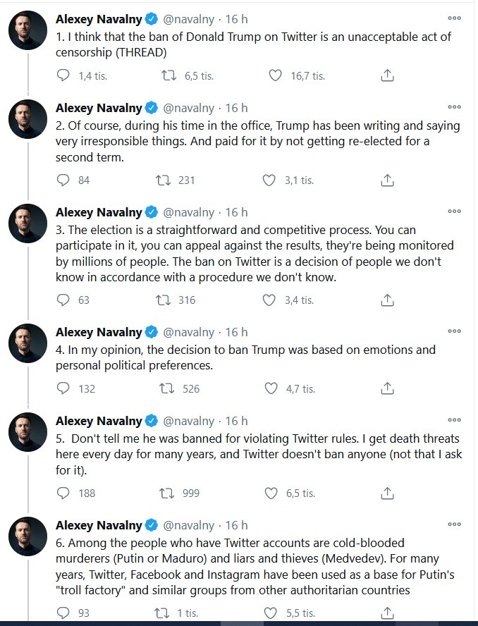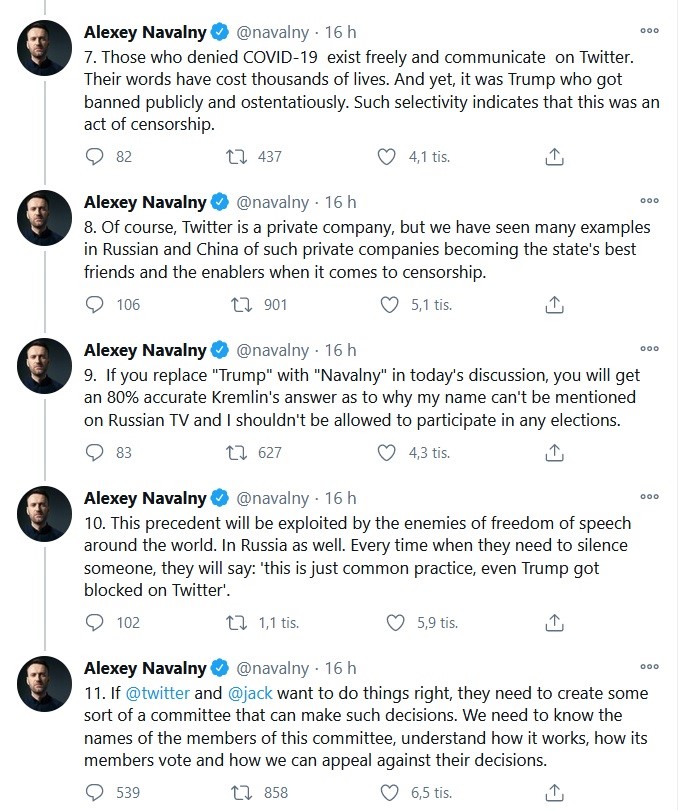 Dokonce i v New York Times jako by měli pochybnosti o tom, jestli taková autokracie bude vždycky benevolentní, a rozhodnutí smazat Trumpův účet kritizoval na Twitteru i ruský opozičník Navalnyj.