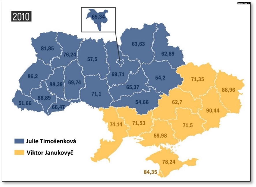 Rozbitím Sovětského svazu rozpor mezi východní hranicí Ukrajiny a etnickým předělem dostal politické vyjádření. Ukrajinsky mluvící západ země povětšině hlasoval pro kandidáty na prezidenta, kteří byli orientováni na Západ; rusky mluvící voliči z východu a černomořského pobřeží hlasovali pro východní orientaci. Názorně to přibližují informace z posledních prezidentských voleb, které nebyly pod vlivem násilí – voleb prezidenta v roce 2010. Právě druhé kolo svým bipolárním charakterem nejvýrazněji ukazuje rozdílnou orientaci.