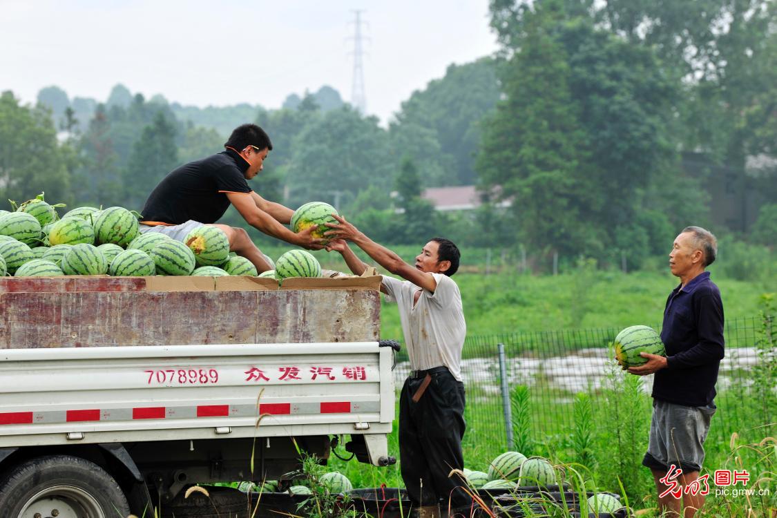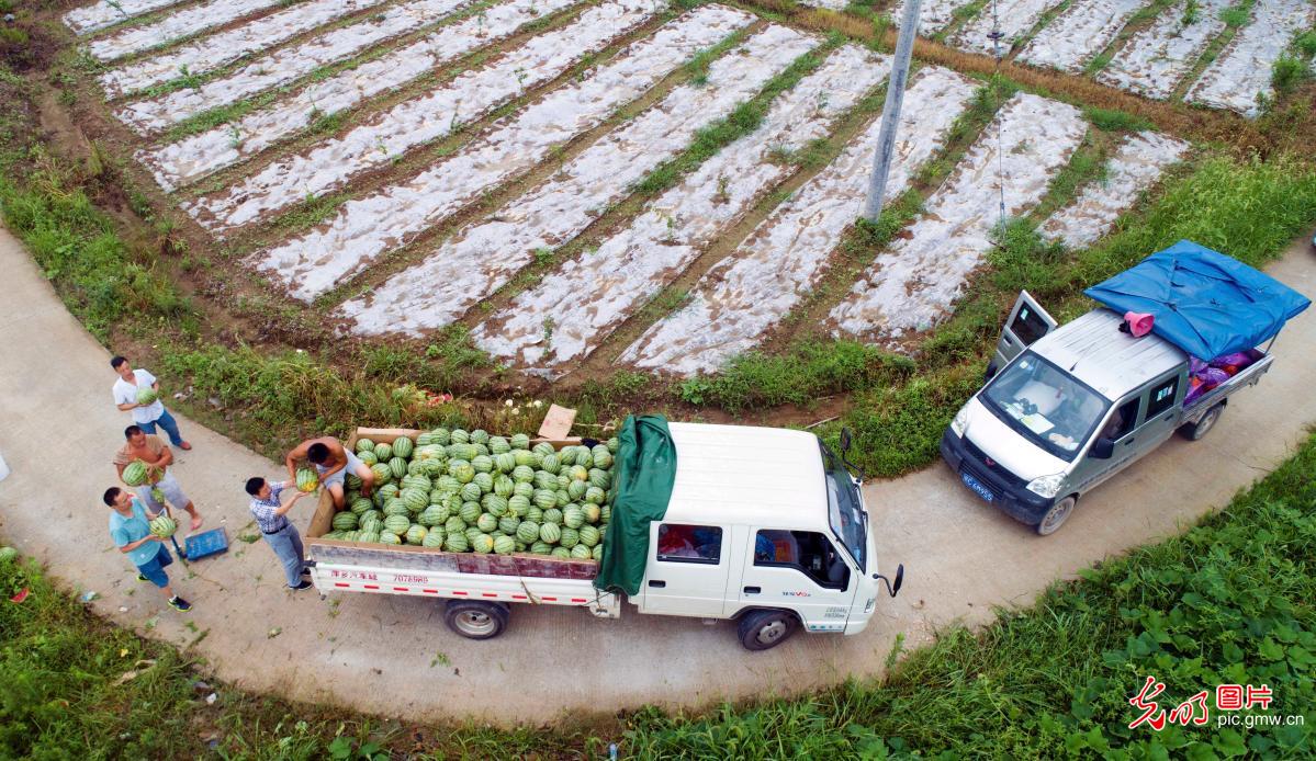 Vesničané ve vesnici Yintian v provincii Jiangxi vybírají vodní melouny na prodej. Ve formátu „vesnický kolektiv + družstevní + chudé domácnosti“ místní vláda podporuje pěstování vodního melounu bohatého na selen s cílem zmírnit chudobu. Více než 1300 místním vesničanům se tak zvýšily příjmy. (Foto: Deng Longhua / Guangming)