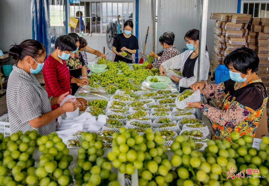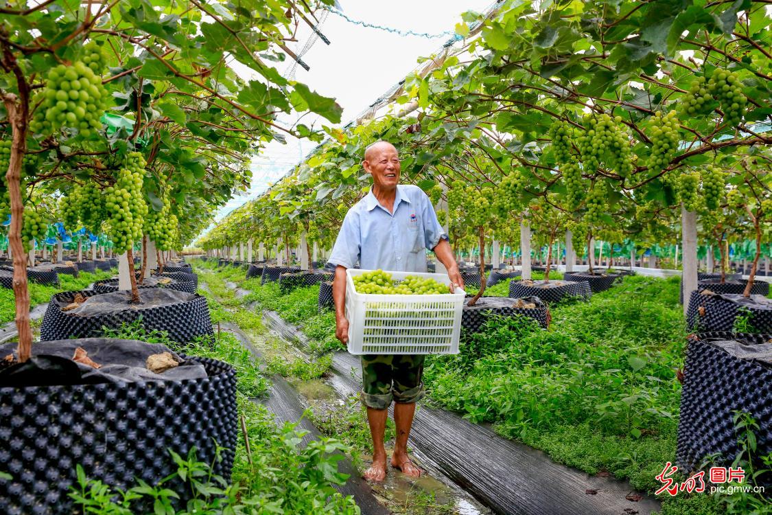 Pěstitelé ovoce sbírají hrozny ve vesnici Xiatang v provincii Zhejiang. Úplně nová výsadba dává dobrou úrodu, která pomáhá zemědělcům zvýšit příjmy a zbohatnout. (Foto: Chen Yueming / Guangming Picture)