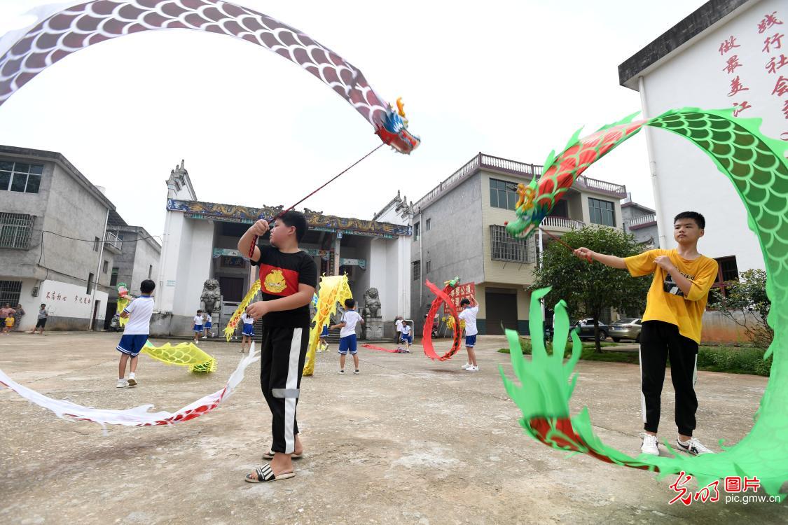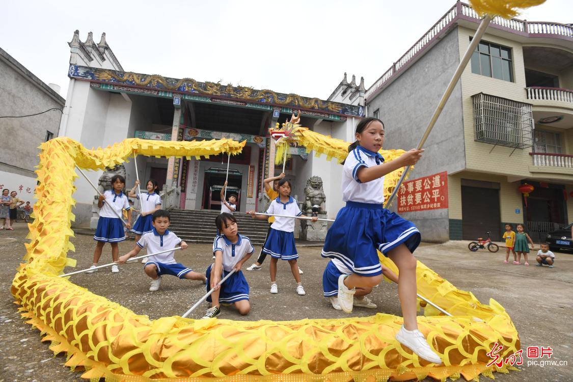 Místní úřady ve vesnici Jiangdong v provincie Ťiang-si vytvořily letní výukový program týkající se nehmotného dědictví tradiční kultury, na kterém učitelé a místní lidé učí děti tanečním dovednostem, jako jsou dračí či liniový tanec, čímž dětem obohacují prázdniny. Fotografie ukazují, jak se děti učí tanec s draky pod vedením svého učitele. (Foto: Zhou Liang / Guangming Picture)