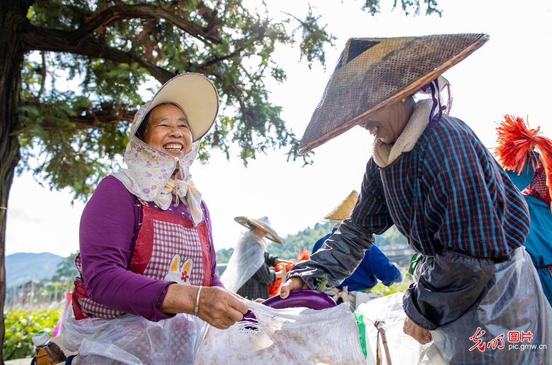 Ve vesnici Xianghui v okrese Shuangjiang v autonomní prefektuře etnické menšiny Dong ve městě Huaihua v provincii Hunan sklízejí ženy z etnické menšiny lilek. Místní úřady vytvořili model rozvoje „předních podniků + profesních družstev + zemědělců“, aby propojili práci zemědělců a dělníků. (Foto: Su Yong / Guangming Picture)