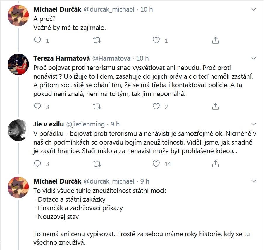 Jie, Jie! Nosíte na Twitteru své satirické jméno podle člověka, který používá podobné paragrafy k tomu, aby umlčel své oponenty, jenom ten kulturní kontext je v Číně samozřejmě jiný než u nás. Stejné je ovšem to, že na tyhle dozorovací mechanismy se vždycky lepí hezky znějící nálepka, aby jejich zavádění ta naivnější část obyvatelstva spolkla bez odporu.